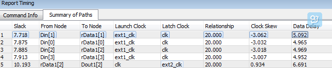 如图7的第一行的slack的值,它刚好等于图6 data required path的值e减data arrival path的值,在这里我们可以看到每一条路径的建立余量,源寄存器和目的寄存器,启动沿,锁存沿,建立关系值,时钟抖动和数据延迟。