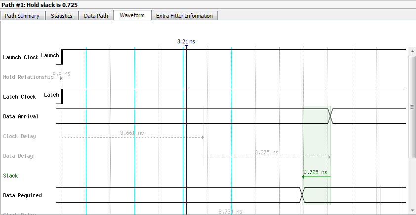通过图5建立余量波形图我们可以知道setup relationship,data arrival time ,data required time,setup slack以及一些其它的延迟参数。