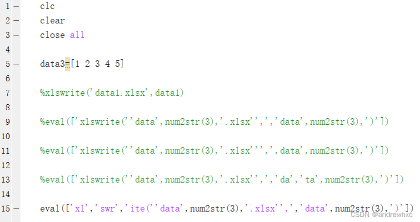 7, 9, 11, 13, 15行都是实现同一个功能,即将data3的数据保存位data.xlsx的excel数据;第7行不用多说,剩下几个其实就是用eval实现对第7行语句的执行;