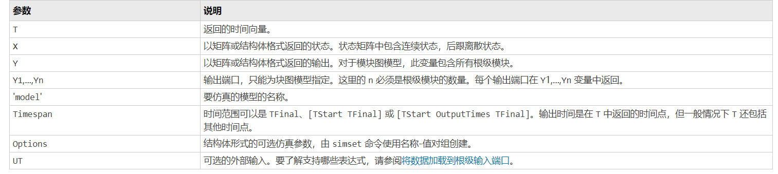 格式:[T,X,Y1,...,Yn] =sim('model',Timespan, Options, UT)