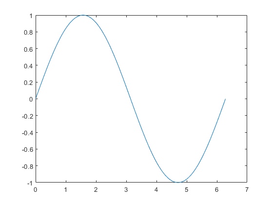 使用冒号运算符创建从 0 至 2π 的 x 值向量,计算这些值的正弦,并绘制结果。