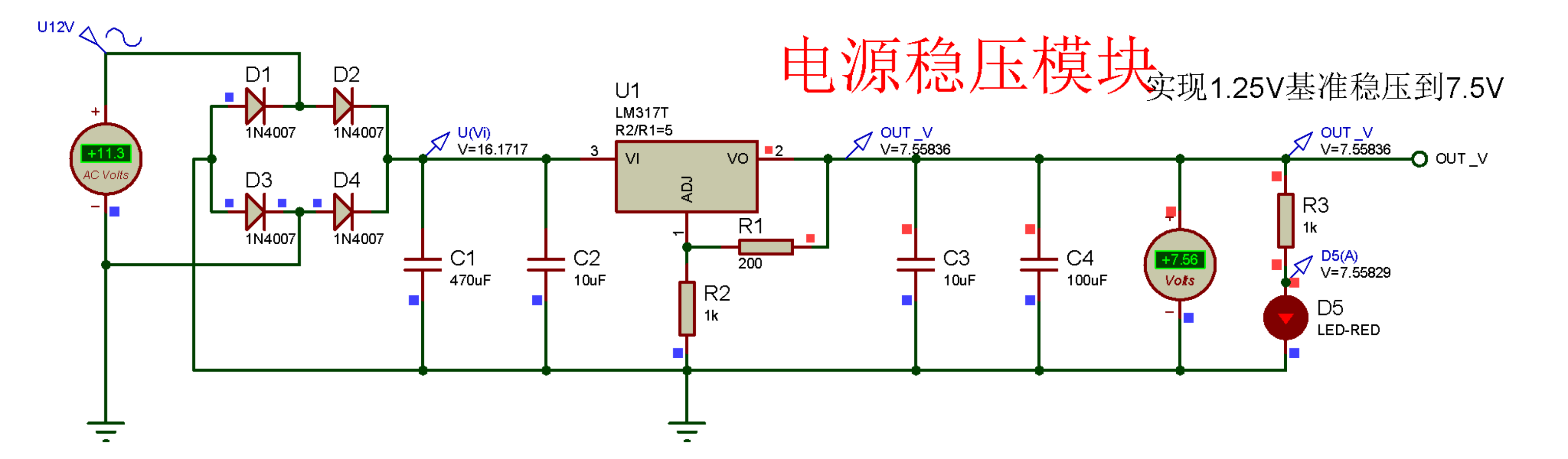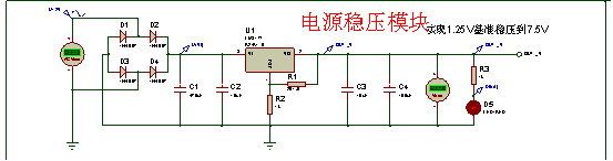 模块说明:先通过电源适配器(变压器)将电压降幅,再经过整流桥的整流作用和电容的滤波作用得到直流电压;该电压再经过三端稳压电源芯片LM317进行稳压;由资料知LM317提供的基准电压为1.25V,据Uo=(1+R2/R1)U计算出R2=5×R1,这里取用R1=200Ω,R2=1k进行设计;再外加一个发光二极管作为电源正常输出的指示,同时串联电阻R3进行限流,以保护发光二极管。这样,理论上便实现了一个稳压7.5V输出的电源稳压模块。电路图如图2.1.1所示: