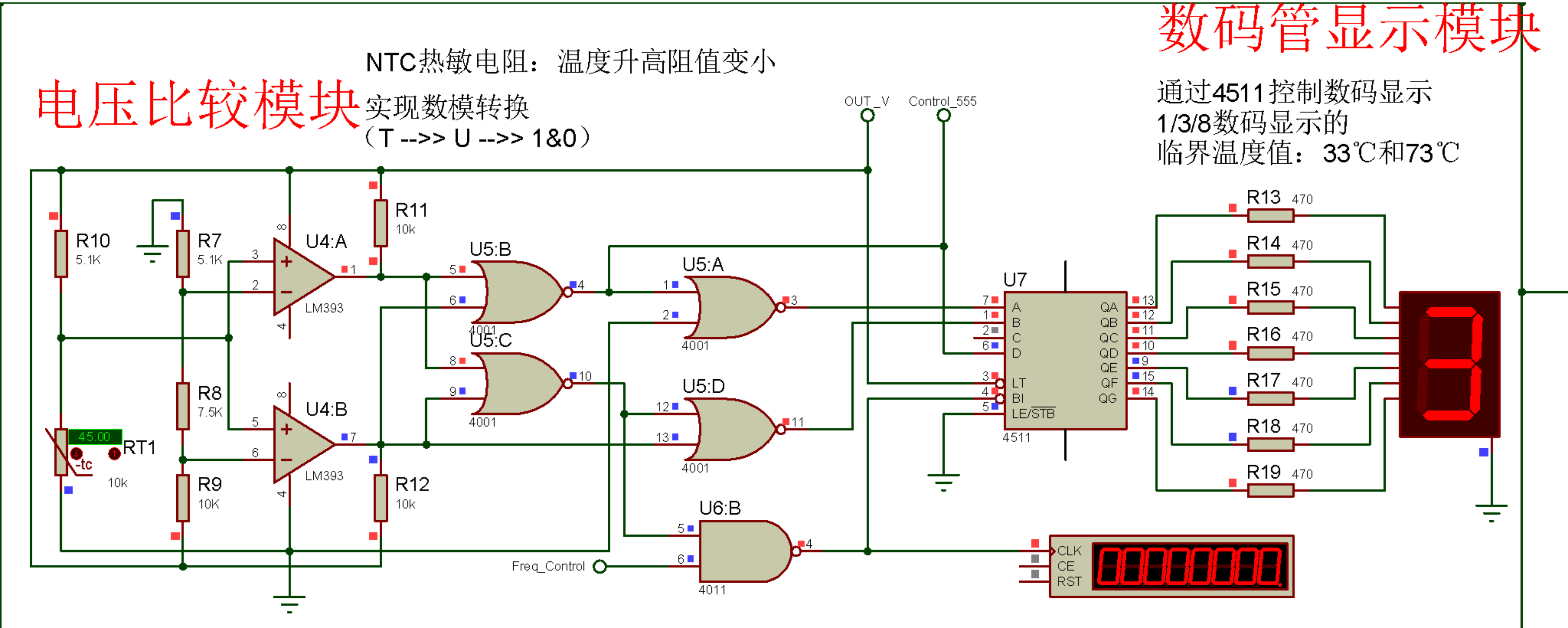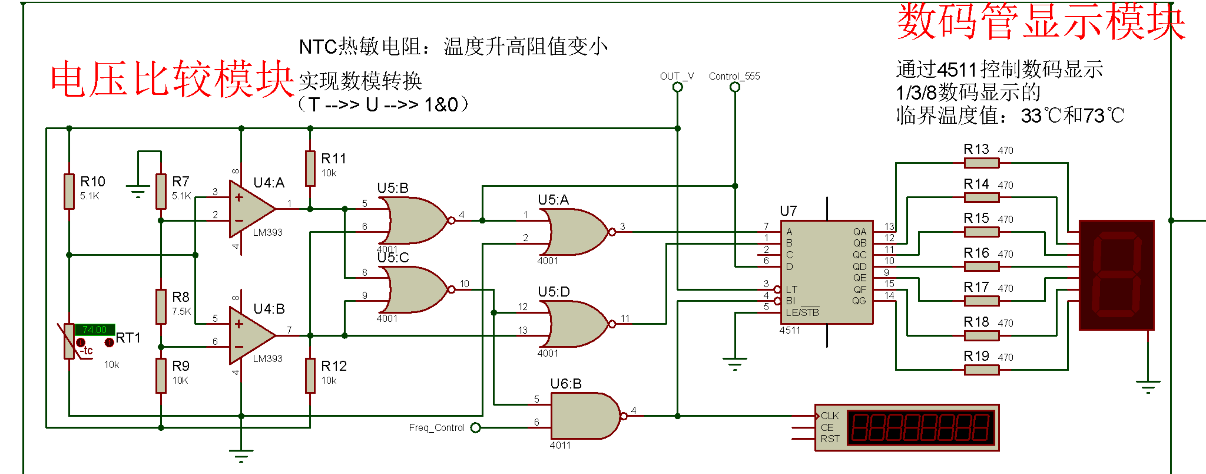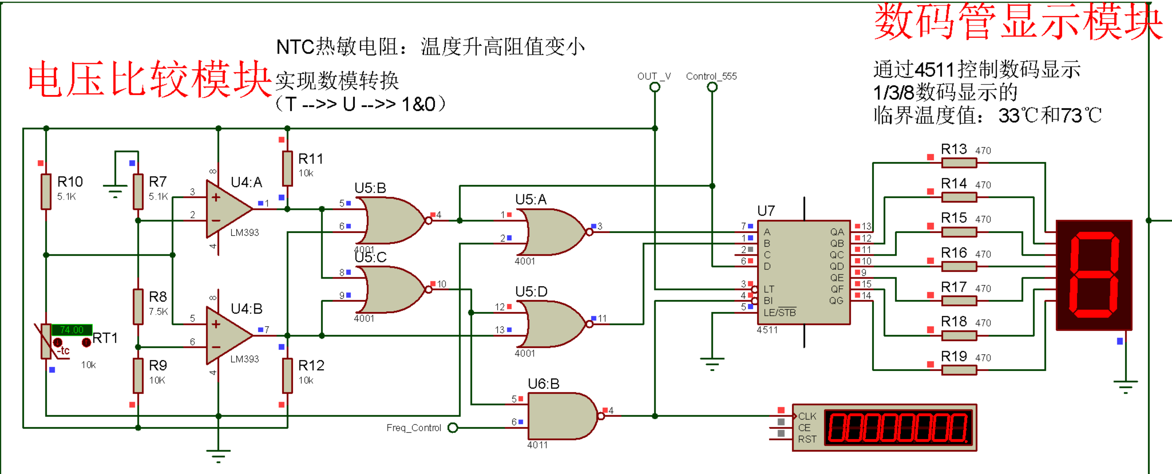 ⑥在温度单调变化过程中,数码管显示数字不得反复跳变,不得显示非法字符,报警与降频电路仅在高温状态下启动。