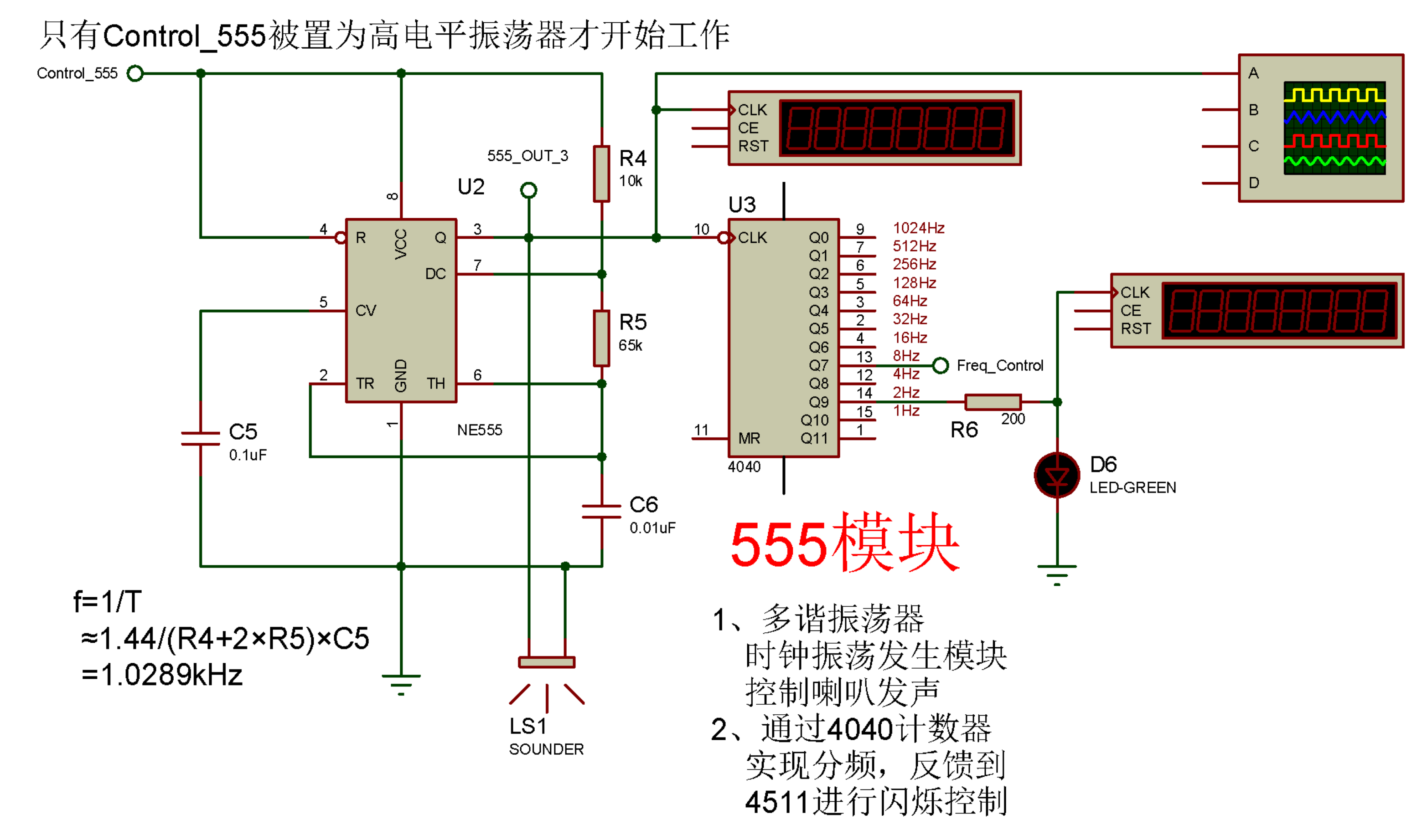 ③报警器输出波形不限,要求基波频率为1024Hz,误差小于10%。