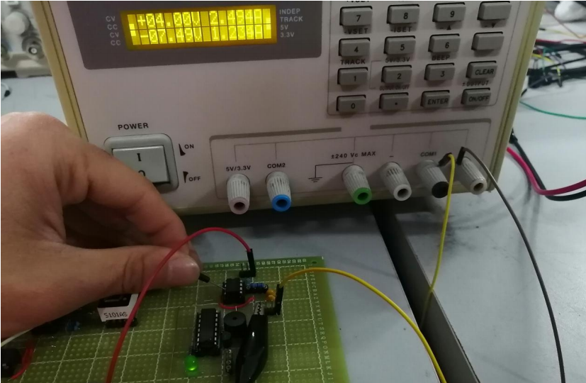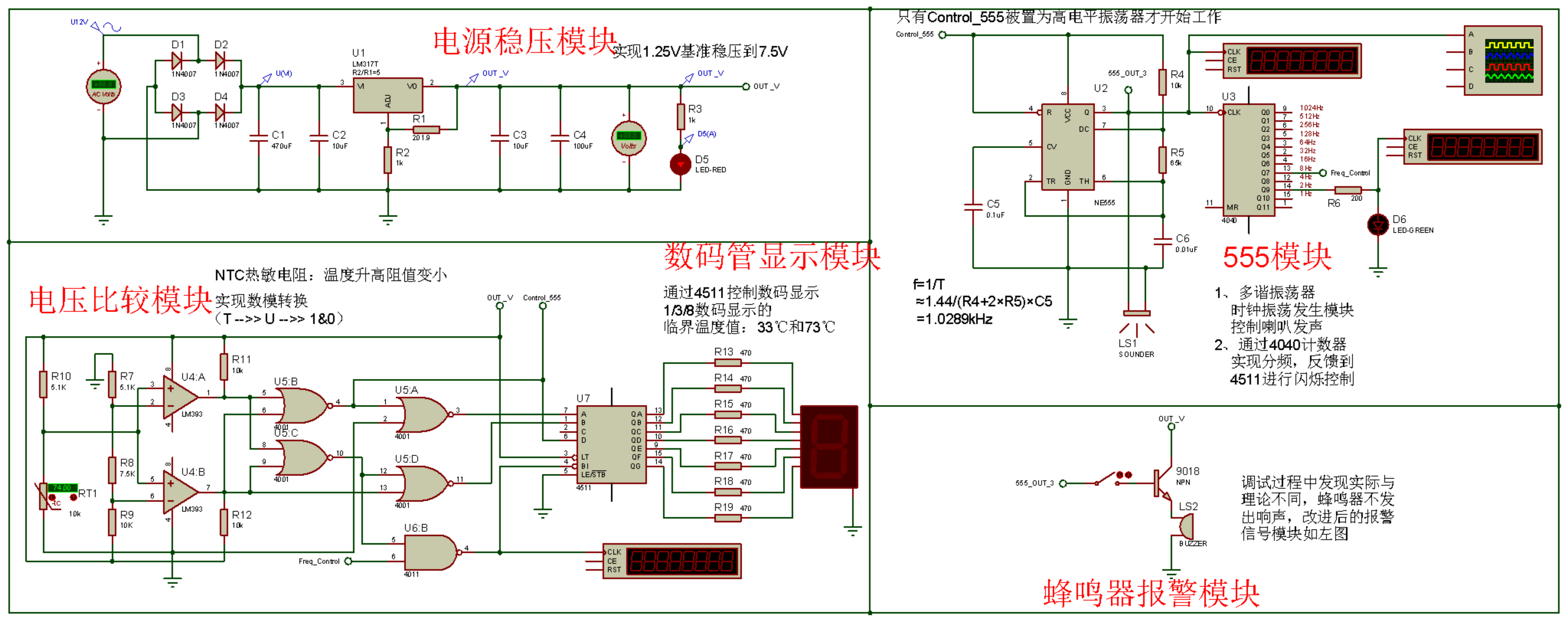 用万用表的直流电压档测量电源模块的稳压输出值;直接给555提供输入7.5V高电平,单独控制555工作,用示波器测量3输出口的输出基波波形;用手捂热以及用焊枪靠近温敏电阻,测试电压比较模块和数码管显示模块是否正常工作,即不同温度下数码管有正常的显示;且在高温下,观察有如下现象:数码管显示“8”并且数字不停闪烁,闪烁频率大约为8Hz,同时扬声器发出报警声。