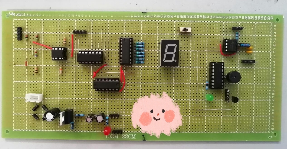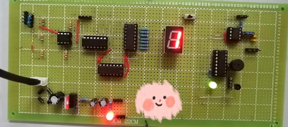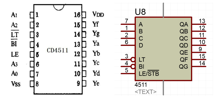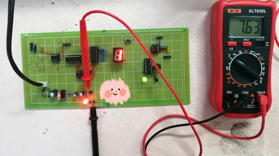 ②在显示“1”、“3”、“8”时,不难可以发现数码管显示有误,经过检查发现焊接没有错误,而是仿真与实物的差距导致的——即CD4511的2脚在仿真中悬空时默认为低电平,但是在实物中悬空时默认为高电平,且抗干扰差。因此,将其2脚接地之后,再进行测试,便可以正确稳定地显示“1”、“3”、“8”。