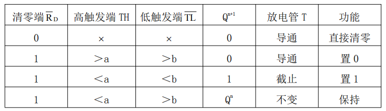 在1脚接地,5脚未外接电压,两个比较器A1、A2基准电压分别为的情况下,555时基电路的功能表如表3.2.2所示。