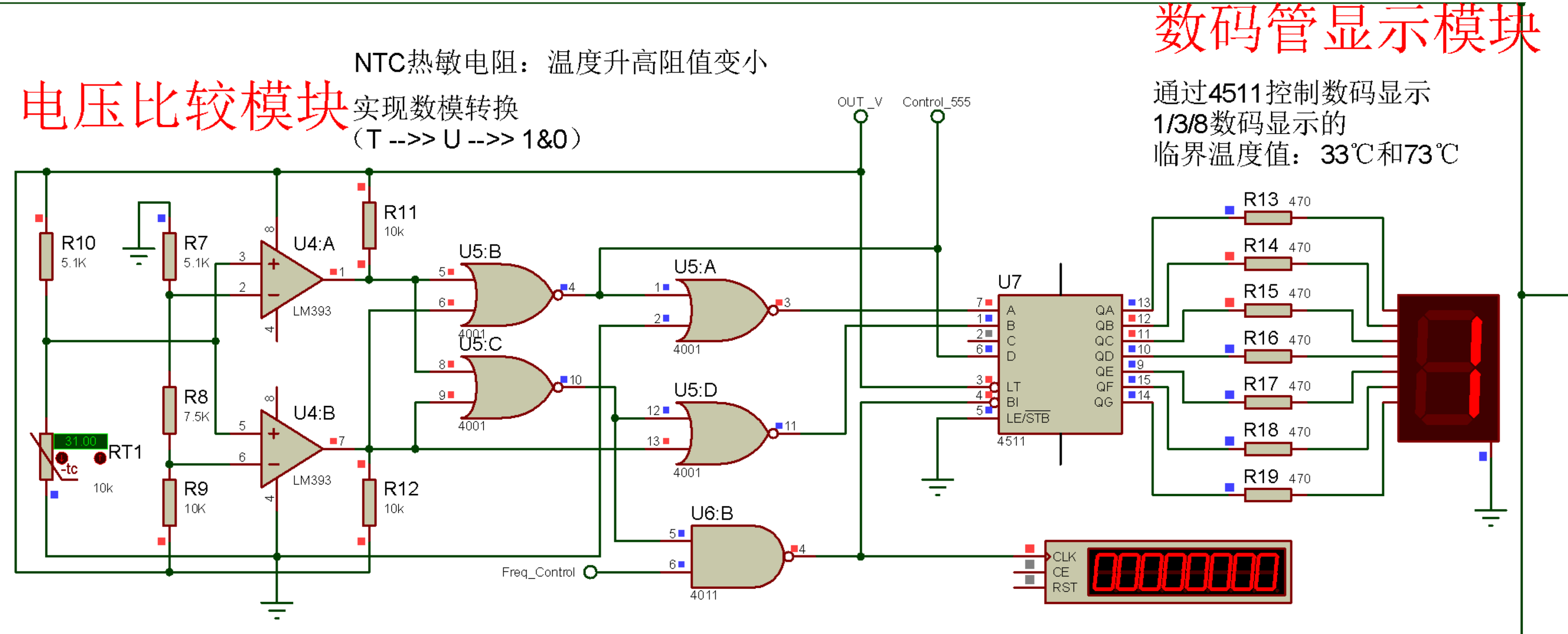 模块说明:(1)电压比较模块:NTC型热敏电阻检测周围环境温度,环境温度变化表现为热敏电阻的电阻值变化,从而影响其与R10之间的电势,该电势作为LM393的两个运算放大器的正端输入。另一回路由三个电阻串联,给出两电势分别作为两个运算放大器的负端输入,设计电阻值以确定数码管显示跳变的临界温度。(2)数码管显示模块:根据数字电子技术的知识进行逻辑的设计,控制CD4511译码器的正确输入,实现要求的“1”、“3”、“8”显示以及消隐端的控制。同时注意数码管的正确接线。如图2.1.2为理论上实现的模块电路图: