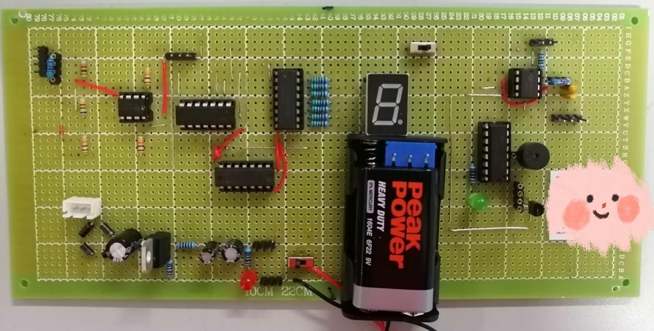 c.电路板其他模块及整体效果测试:正确接入电源适配器,观察数码管是否正确地显示“1”;用焊枪靠近温敏电阻,观察数码管是否先后正确显示“3”和“8”;且最终正确地显示“8”时,观察是否伴随着数字“8”不停闪烁,闪烁频率是否大约为8Hz,同时扬声器是否发出报警声;将焊枪离开后,观察数码管是否先后正确显示“8”、“3”、“1”,当数码管显示“1”时表明检测到的温度已下降回室温,此时再用手捂热温敏电阻一定时间或者对热敏电阻呵气,观察数码管是否正确地显示“3”,若没有则可能是电阻选取不合理导致数码管数字跳变的温度偏高而无法在体温下正确得显示“3”。