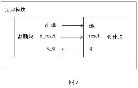 另一种是在一个虚拟的顶层模块中调用(实例引用)激励块和设计块,激励块和设计块之间通过接口进行交互,如图2。激励块驱动信号d_clk和d-reset,这两个信号则连接到设计块的clk和reset输入端口,激励模块同时检查和显示信号c_q,这个信号连接到输出端口q,顶层模块的作用只是调用(实例引用)设计块和激励块。