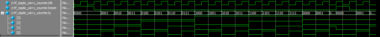 module stimulus; reg clk; reg reset; wire [3:0] q; //实例引用已经设计好的模块 ripple_carry_counter r1(q,clk, reset); //控制驱动设计块的时钟信号,时钟周期为10个单位时间 initial clk =1'b0;//把clk设置为0 always #5 clk =~clk;//每5个时间单位时钟翻转一次,即时钟周期为10个时间单位 //控制驱动设计块的reset信号 initial begin reset = 1'b1; #15 reset = 1'b0; #180 reset = 1'b1; #10 reset =1'b0; #20 $finish;//终止仿真 end //监视输出 initial $monitor($time," Output q= %d",q); endmodule