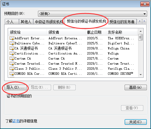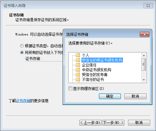 3、下一步 找到所需要配置的*.crt证书文件,双击安装证书,选择第二项,将所有的证书放入下列储存区(受信任的根证书颁发机构) ,点击浏览,选择受信任的根证书颁发机构。