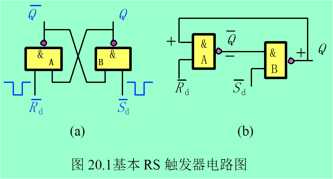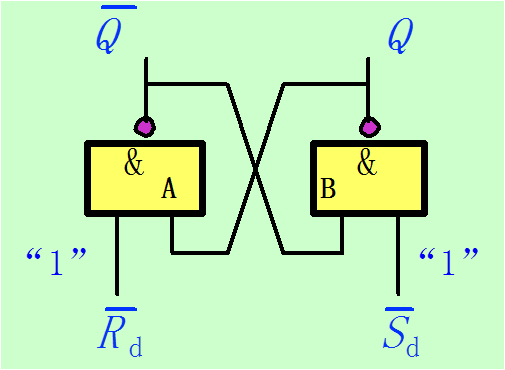 定义一个与非门的输出端为基本RS触发器的输出端Q ,图中为B门的输出端。另一个与非门的输出端为非Q端,因Q端和非Q端为同一个与非门的输入端和输出端(另一输入端为高电平),所以这两个端头的状态应该相反。定义A门的另一个输入端为非Rd端,称为直接置“0”端,或直接复位端(Reset);B门的另一个输入端为