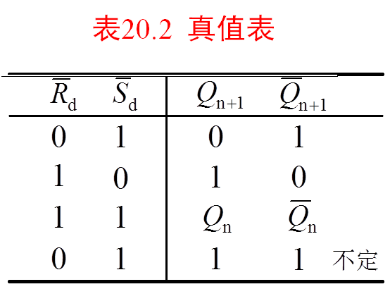 基本RS触发器用真值表来描述,表中的Qn和表示触发器的现在状态,简称现态;Qn+1和表示触发器在触发脉冲作用后输出端的新状态,简称次态。对于新状态Qn+1而言,Qn也称为原状态。