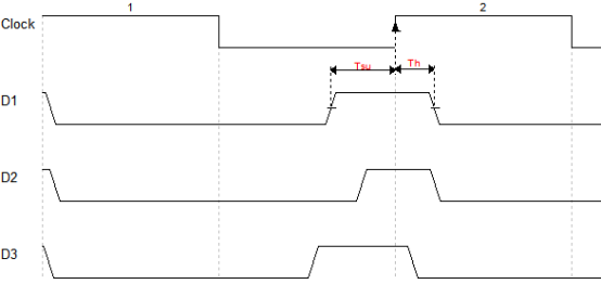 在第二个时钟上升沿的时候,要锁存住输入端D的高电平,D1是满足了建立时间和保持时间的情况;而D2则是建立时间没有满足,因此不能成功锁存住输入的高电平;D3保持时间不满足,也不能成功锁存输入的高电平。