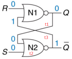 ·输入R=0,S=0时:对于或非门N1,输入是0和Q’,由于Q’不知道是0还是1,因此Q的输出不能确定;对于或非门N2,输入是0和Q,由于不知道Q的值,因此Q’也不能确定...这就无限循环下去了,于是我们像交叉耦合反相器那样进行输出假设: