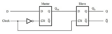 假设要传输的数据D=D1:在(clock简称clk)clk=0的时候,主锁存打开进行传输数据,把输入传送到从到从锁存器的输入端,即Qm = D1。然后clk从0→1的时候,主锁存器准备关闭,保持原来的值D1,与此同时从锁存器准备打开,把Qm的值传输到输出Qs,也就是Qs=Qm=D1。在clk=1的时候,主锁存器是关闭的,Qm保持D1不变,即Qm=D1;从锁存器是打开的,Qs=Qm=D1。接着clk从1→0的时候,主锁存器准备打开,准备传输数据;而从锁存器准备关闭。在clk=0的时候,主锁存打开进行传输数据,把输入传送到从到从锁存器的输入端,即Qm *= D2;与此同时,从锁存器关闭,由于新的Qm即Qm*还没有到达从锁存器的D端,因此在从锁存器关闭的时候,从锁存器锁存的是原来的值即D1,因此输出Qs =D1。然后接下来上升沿就传输D2....