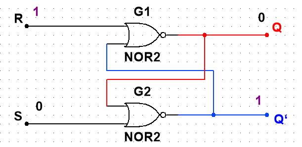 假设G1的下引脚是0,那么R为1时,Q为0,当R变成0时,Q就会变成1。
