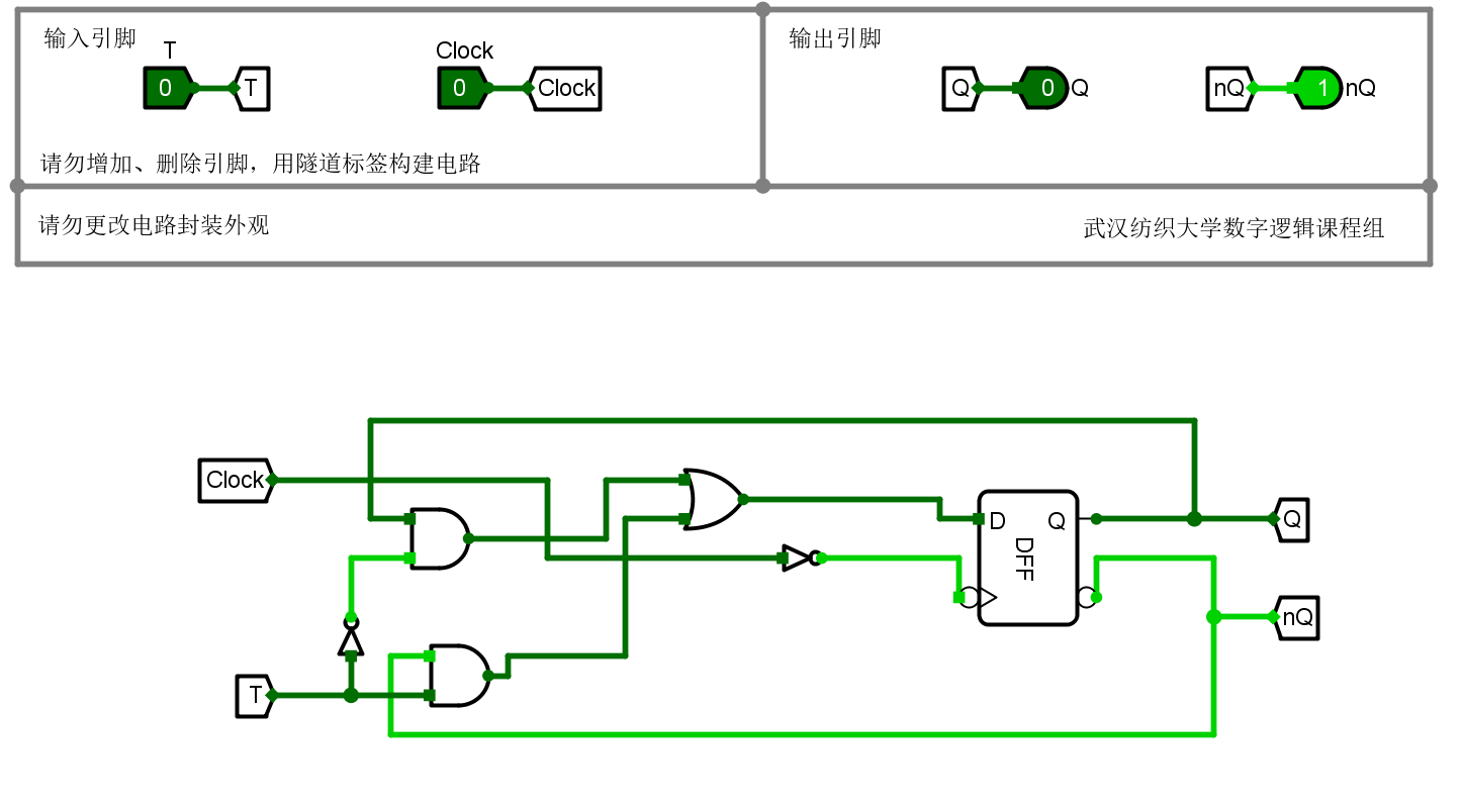 本关任务:在Logisim中,在D触发器的基础上构建T触发器,要求时钟上升沿触发