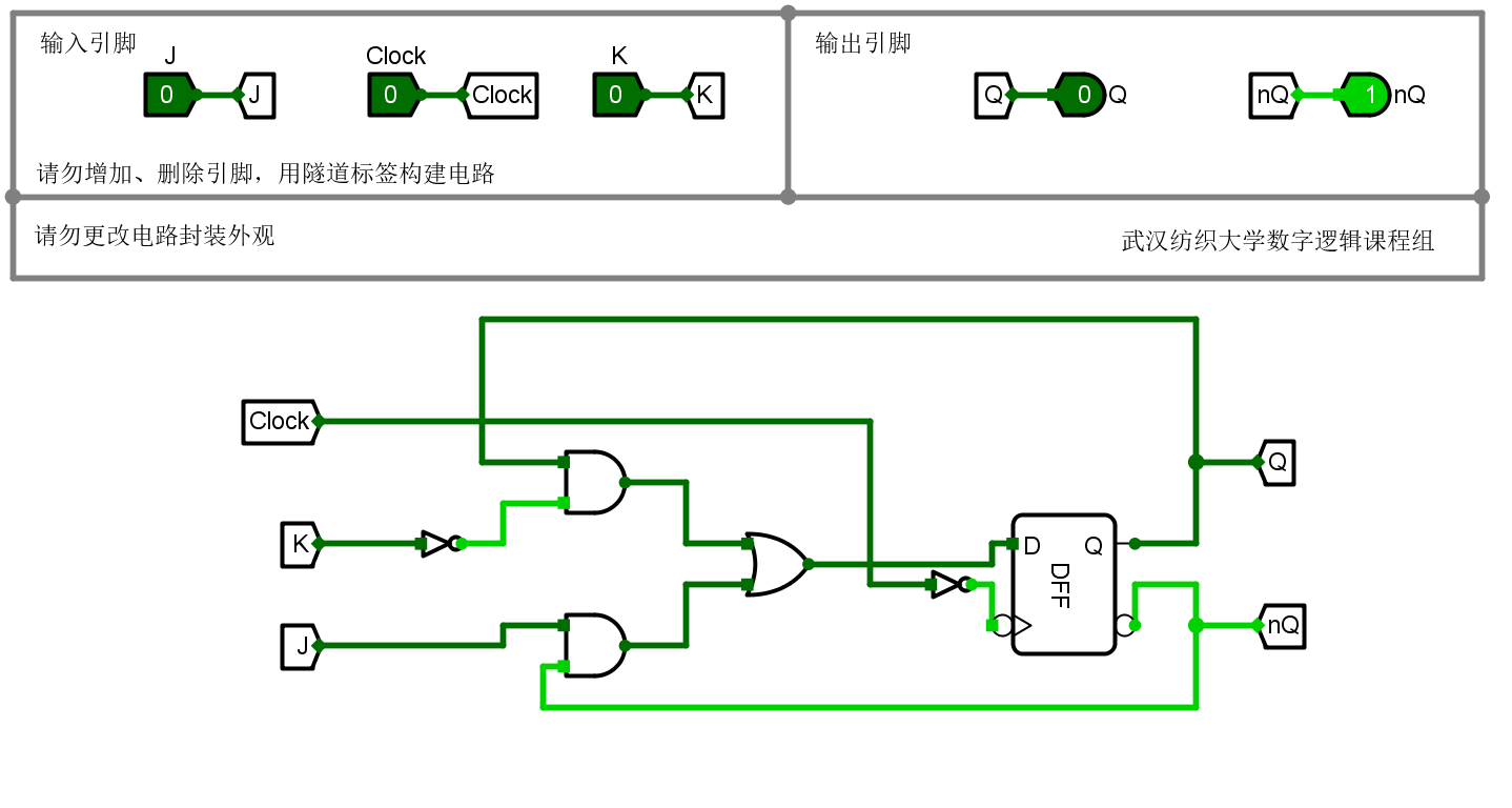 本关任务:在Logisim中,在D触发器的基础上构建JK触发器,要求时钟上升沿触发。
