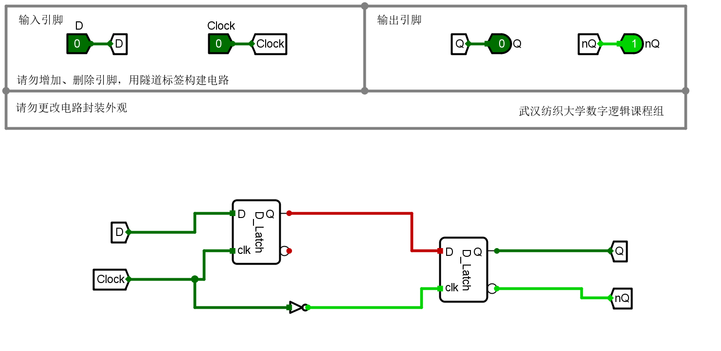 本关任务:在Logisim中,用两个D锁存器级联构建主从式D触发器,要求下降沿触发。