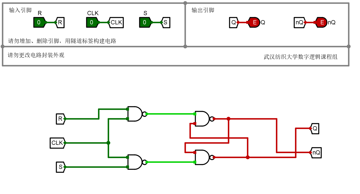 本关任务:在Logisim中,用四个与非门构建门控SR锁存器。