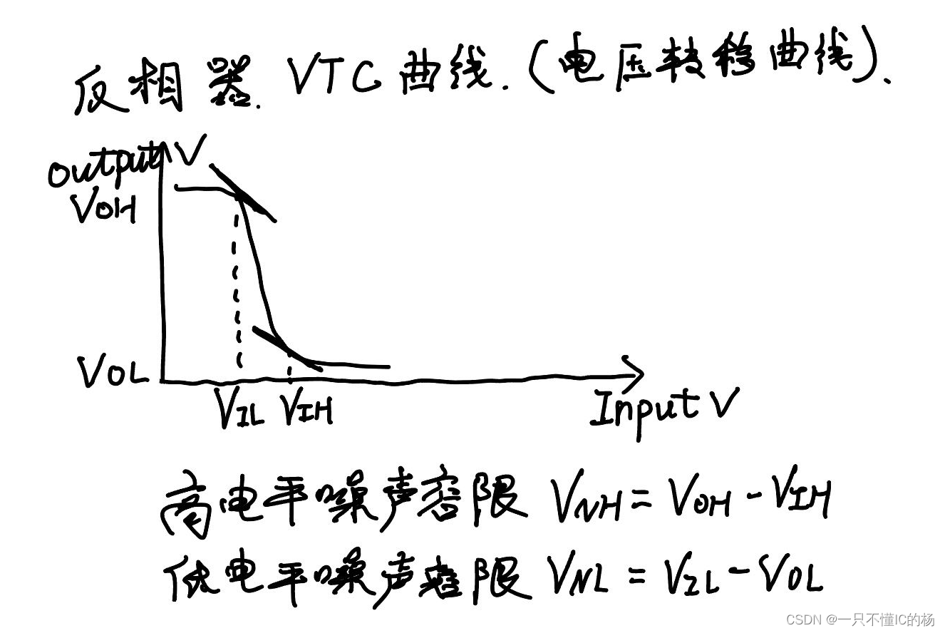 前一极输出为最坏的情况下,为保证后一极正常工作,所允许的最大噪声 幅度 VIH:输入电压由高到低变化时,输出电压开始上升且传输特性曲线斜率为-1 的点。(仍能 维持输出为逻辑 “0” 的最小输入电压) VIL:输入电压由低到高变化时,输出电压开始下降且传输特性曲线斜率为-1 的点。(仍能 维持输出为逻辑 “1” 的最大输入电压)
