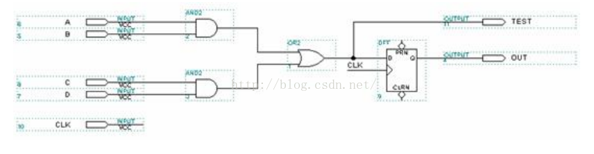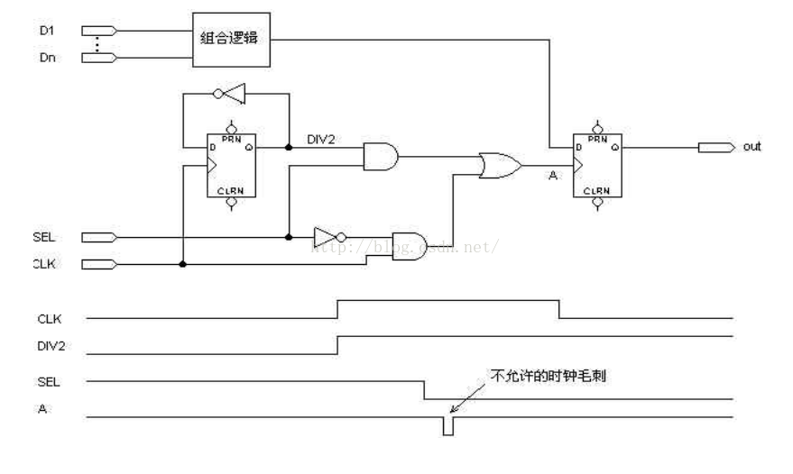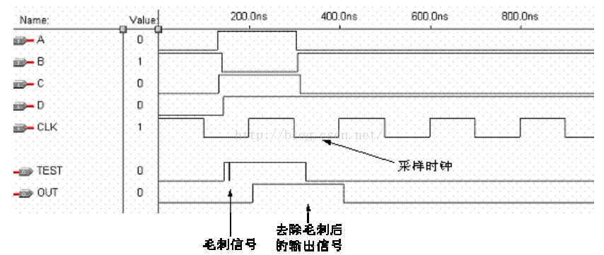 信号在 FPGA 器件内部通过连线和逻辑单元时,都有一定的延时。 延时的大小与连线的长短和逻辑单元的数目有关,同时还受器件的制造工艺、工作电压、温度等条件的影响。信号的高低电平转换也需要一定的过渡时间。由于存在这两方面因素,多路信号的电平值发生变化时, 在信号变化的瞬间, 组合逻辑的输出有先后顺序,并不是同时变化,往往会出现一些不正确的尖峰信号,这些尖峰信号称为"毛刺"。如果一个组合逻辑电路中有"毛刺"出现, 就说明该电路存在"冒险"。 (与分立元件不同, 由于PLD 内部不存在寄生电容电感,这些毛刺将被完整的保留并向下一级传递,因此毛刺现象在PLD、FPGA设计中尤为突出)图 2是一个逻辑冒险的例子,从图 3的仿真波形可以看出,"A、B、C、D"四个输入信号经过布线延时以后, 高低电平变换不是同时发生的, 这导致输出信号"OUT"出现了毛刺。 (我们无法保证所有连线的长度一致,所以即使四个输入信号在输入端同时变化,但经过PLD内部的走线,到达或门的时间也是不一样的,毛刺必然产生)。可以概括的讲,只要输入信号同时变化, (经过内部走线) 组合逻辑必将产生毛刺。 将它们的输出直接连接到时钟输入端、清零或置位端口的设计方法是错误的, 这可能会导致严重的后果。 所以我们必须检查设计中所有时钟、清零和置位等对毛刺敏感的输入端口,确保输入不会含有任何毛刺。