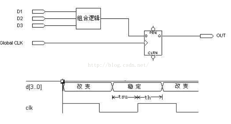 图 1 定时波形示出触发器的数据输入 D[1..3]应遵守建立时间和保持时间的约束条件。建立和保持时间的数值在FPGA数据手册中给出,也可用软件的定时分析器计算出来。如果在应用中不能满足建立和保持时间的要求,则必须用时钟同步输入信号。