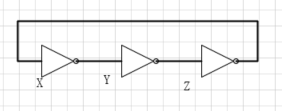 但是对于X的值来说,需要两次通路就会有一次循环,然后这个模式会一直的持续重复下去,如果假设一个反相器有1ns的延迟,那么每个结点(x or y or z)在0~1之间摆动,这个电路称为环形振荡器