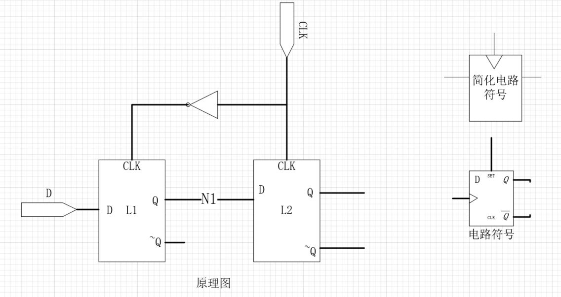 通过两个D触发器受同一CLK信号控制实现,前一个触发器L1为主锁存器,后一个触发器L2为从触发器。
