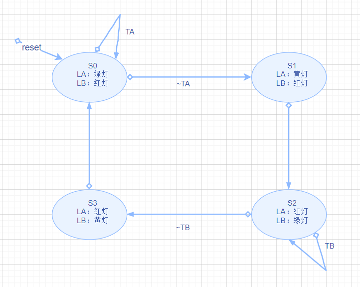 只要LA所在的Academic 大道上有交通,则LA就恒为绿灯,当且只当,Academic大道上没有交通时,则一定会转向S1状态,S1和S3都无法长期保持,都会在下一个时钟周期进行转换。