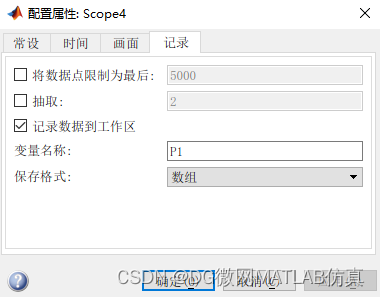 点击示波器设置选项>记录>记录数据到工作区>设置变量名称>保存格式为数组 >运行仿真