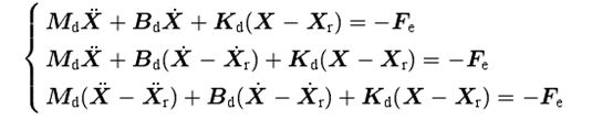 上面提到的阻抗控制数学模型的三个公式没有考虑力的跟踪,下面引入参考力Fr,定义误差力Fe=Fr-Fc得到如下公式: