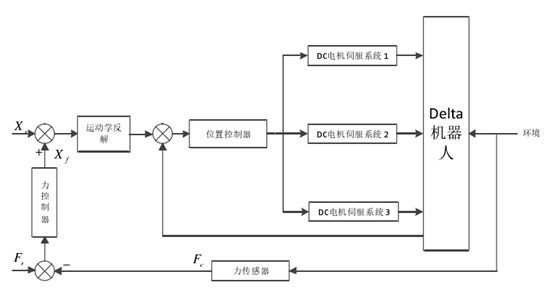 定义Xf=X-Xr,通过上述公式可以将机械臂末端与环境之间的接触力转化成位置信号,将这个位置的修正信号和期待的位置信号叠加,然后对位置信号用PID控制,就能实现对接触力/位置的同时控制。如果把PID位置控制放在内环,把利用阻抗模型对力转化为修正位置的过程放在外环,那这种结构就是基于位置的阻抗控制。下图是基于Delta机器人的阻抗控制分析图(来源于哈工大 丁润泽硕士论文)