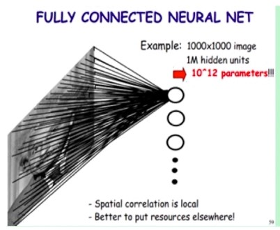 假设图片是 1000 * 1000像素的,有一层隐藏层,隐藏层的大小是 10 ^ 6,那么我们的参数大小有 10 ^ 12。