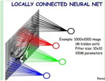 如上面那个图显示的一样,每个神经元只和一部分的像素点进行连接,比如他这里有 10 ^ 6个神经元,每个神经元只和 10 * 10的像素点进行连接,那么就有 10 ^ 8 比起一开始的时候少很多。为了不影响下面的理解这里说细一点,也就是每一个神经元都是 10 * 10, 有10 ^ 6个神经元 10 * 10 * 10 ^ 6 = 10 ^ 8个参数,但此时每个神经元内的参数和其他神经元参数是不一样的。