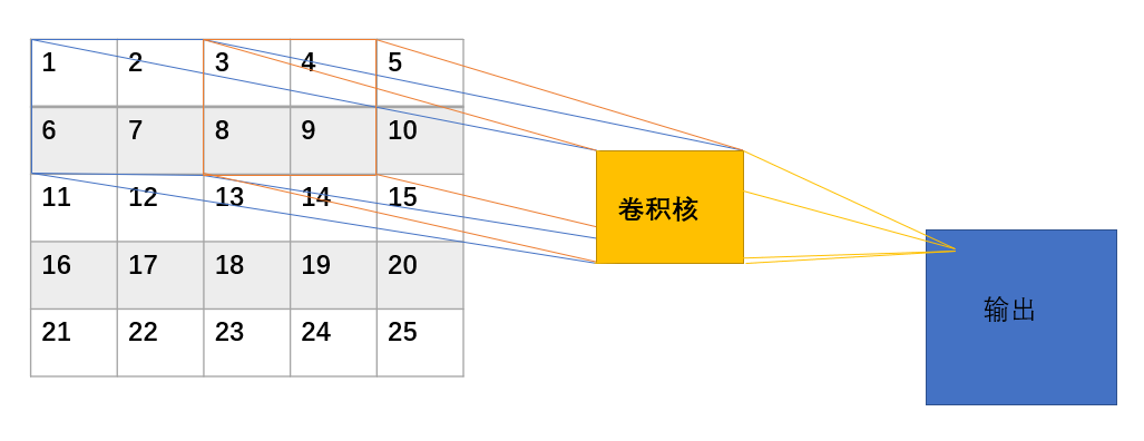 那么我们的卷积核从图片上滑过,从左到右,从上到下,每个区域都和卷积核计算出来一个值放在输出的一个地方,每个值可以代表一个神经元,那么一整张图片我们不知道我们要捕捉的特征在哪,那么假设我们的特征在上图中的左上角,也就是蓝色方框内,那么我们在右侧的输出的左上角对应的那个神经元被激活,若是图像特征在橙色的区域,那么我们右侧的最上面的第二个神经元被激活,也就是不管图像在哪,都会被卷积核捕捉放到某个神经元上。
