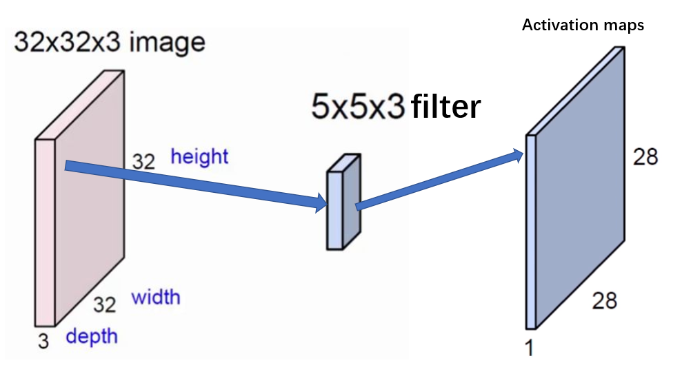 左侧是一个多通道的图, 我们将右侧的蓝色的卷积核也变为多通道的,每个通道 5 * 5,每个通道的卷积的参数是不共享的,一般来说也可以描述成尺寸 5 * 5,深度为3的filter。