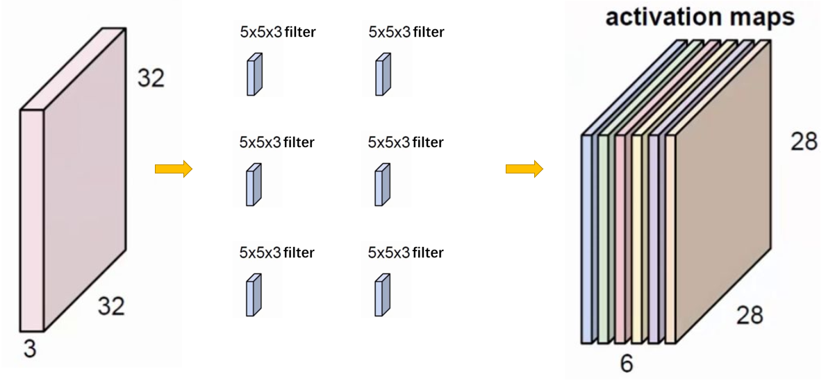 经过一层卷积,32个filters,变成 28 * 28 * 32。每个filter都会像手电筒一样扫一遍原本的图片,扫一遍就增加一层。扫了32遍