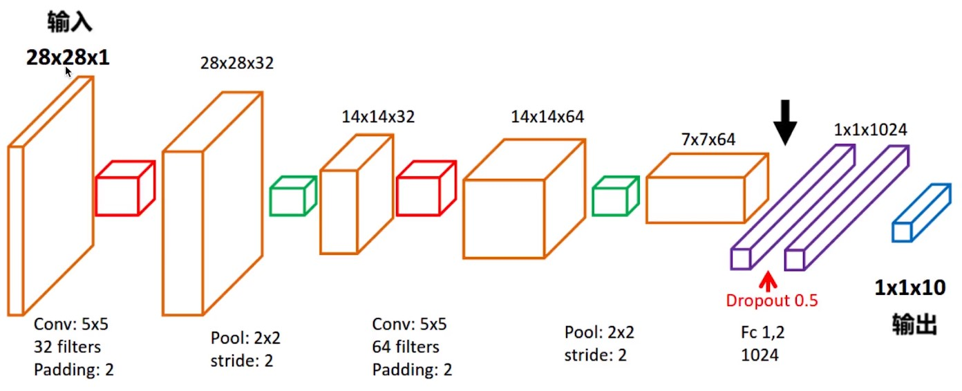 经过池化层max pooling变成 14 * 14 * 32,在经过第二层的卷积,64个过滤器,变成14 * 14 * 64 在经过一层pooling变成 7 * 7 * 64