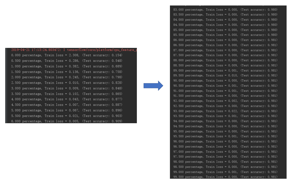 print("%.3f percentage, Train loss = %.3f, (Test accuracy: %.3f)" % (_ / 20000 * 100, train_loss, test_accuracy))