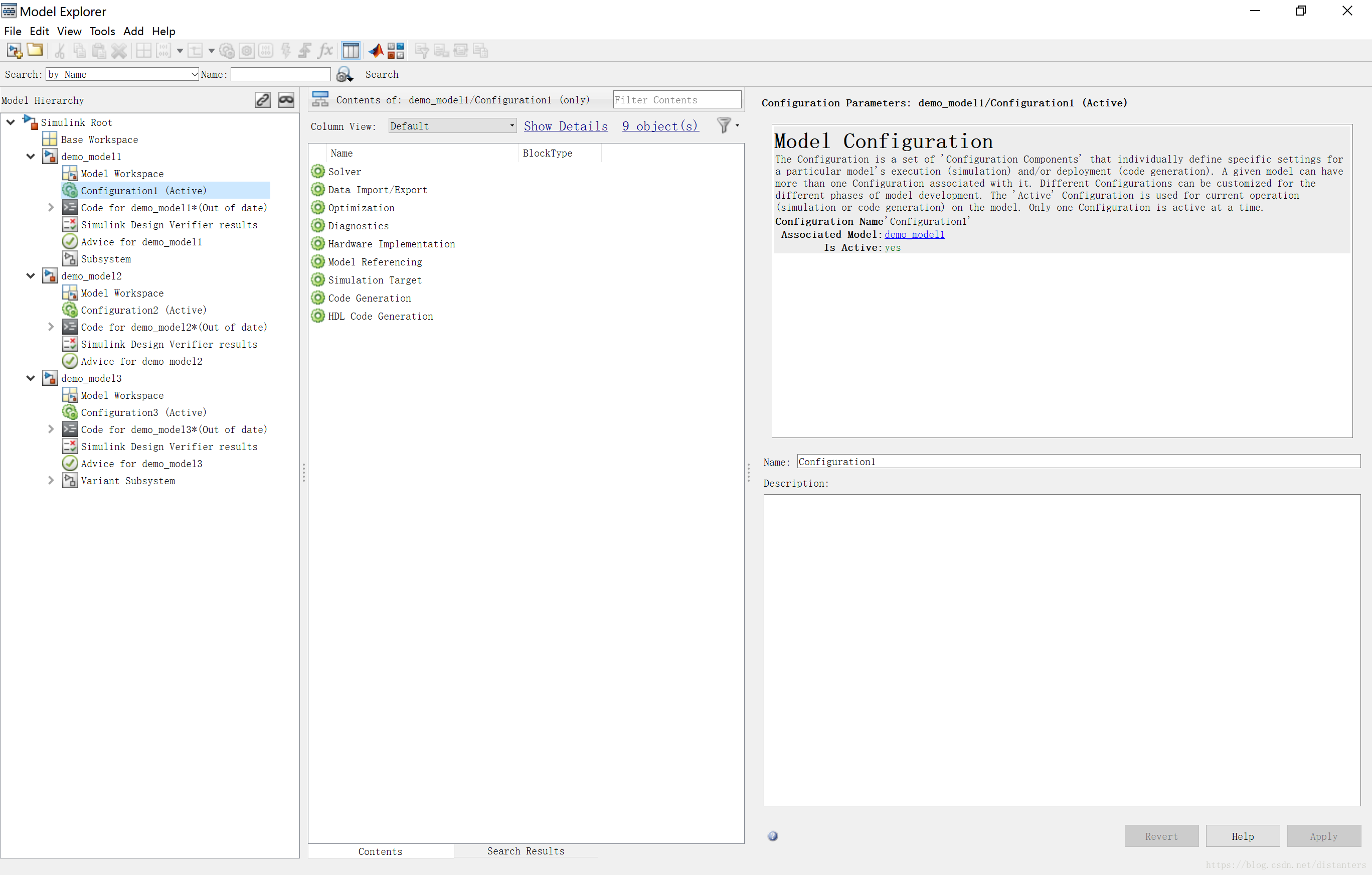 任意模型界面,通过 Ctrl + H 可以打开 Model Explorer,如下图,包含三个模型,demo_model1~3,所有模型的 Configuration 处于激活状态