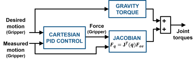 - 反馈术语对终端执行器的 XYZ 位置进行 PID 控制 (我们忽略方向, 但你真的不应该!) 计算最终效应器坐标系下所需的力。然后, 雅可比将控制输出转换为关节扭矩和力。