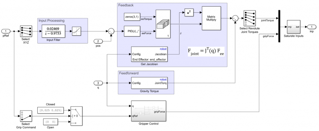 - 前馈期限使用逆动力学对我们的机械手模型。这计算所需的关节力/扭矩, 使机械手遵循所需的运动, 并补偿重力。