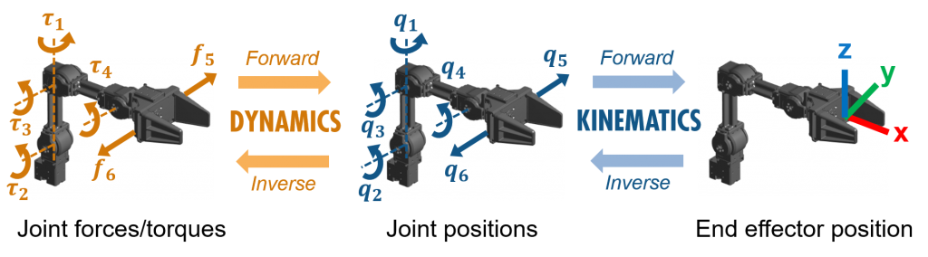 为了重述前面的部分, 运动学将机器人机械手的关节位置映射为感兴趣的坐标系的位置和方向-通常是端部效应器。另一方面, 动力学将所需的关节力和扭矩映射到它们的位置、速度和加速度。