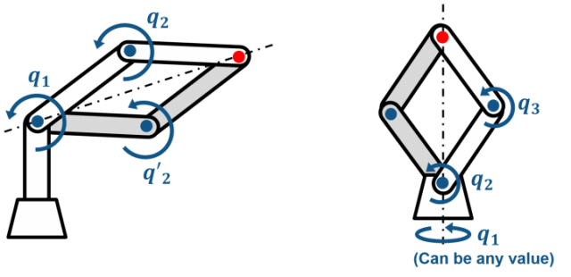 (左) 7 自由度机械手可以将末端效应器定位为多个有效解。