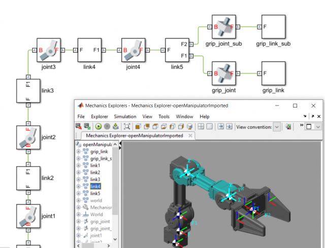 从2018a 版开始, 机器人系统工具箱包括一个机械手算法的仿真块库。这些块允许您对刚体树对象进行运动学和动态分析, 从而使上述两种表示在系统级仿真和控制设计应用中共同工作。在2部分中, 您将进一步了解这一点。