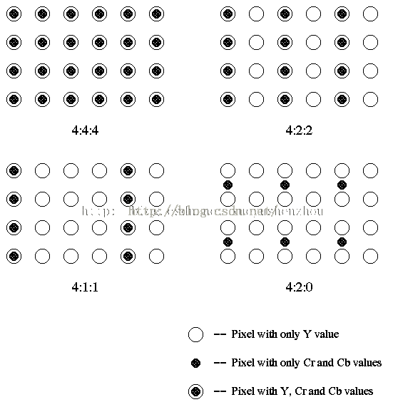 四种典型的采样如上图所示。首先明白,三种点各表示什么,空心圆圈是Y采样,但是CrCb是一个整体,大圈套小圈表示具有Y、Cr和Cb的点。
