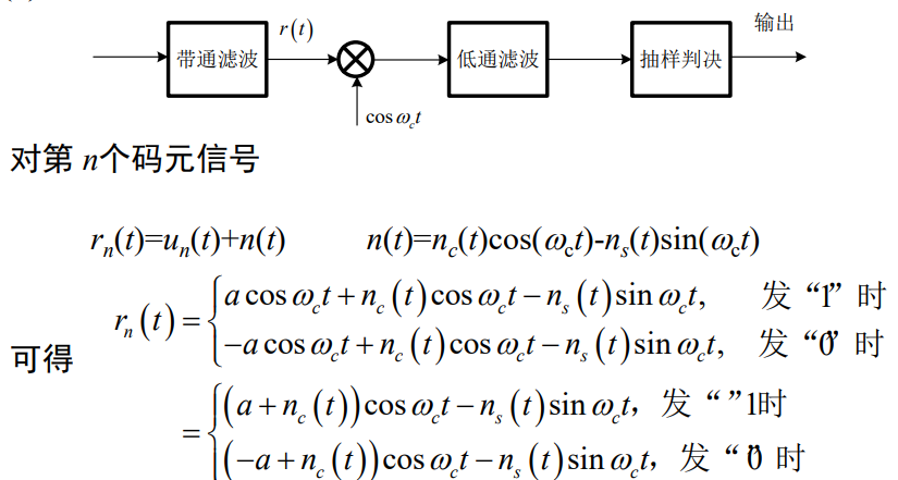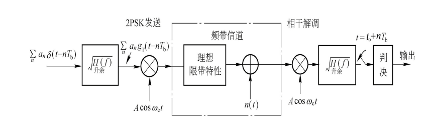 在理想限带及加性白高斯噪声干扰的信道条件下,2PSK的最佳频带传输系统框图: